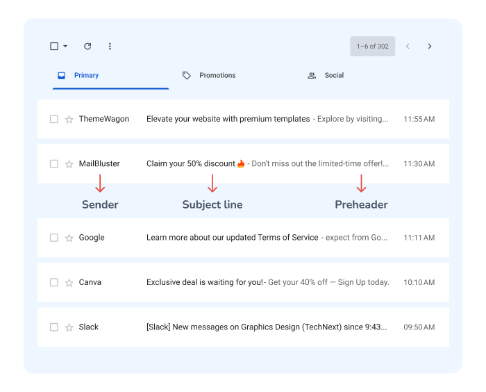 An email preheader is a short-lengthed text that comes right after the email subject line in an email inbox view. It is also called email preview text. A preheader can be added to the email using HTML and CSS or email marketing tools like our MailBluster, where no coding knowledge is required.