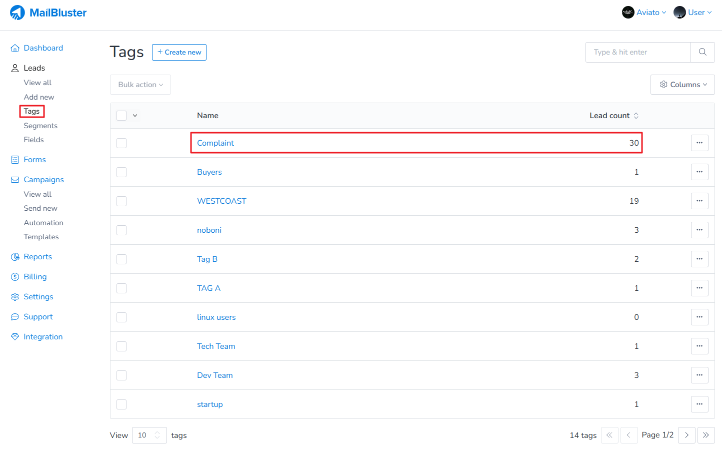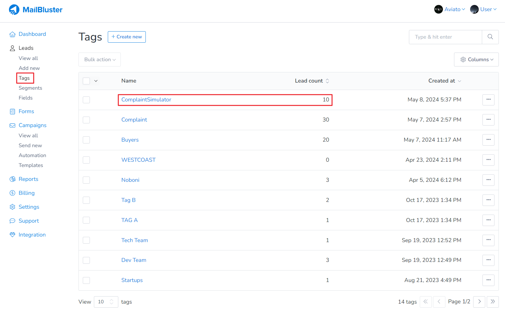 Now click on Tags and you will notice that the tag name “ComplaintSimulator” has been created and the Lead count shows the number of leads assigned to this tag. Click on the tag.