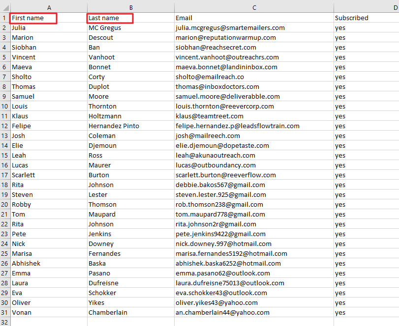 Here is a sample CSV file on Google Sheets with the mandatory columns highlighted for uploading leads to MailBluster. You can follow this format to upload your data to Leads section of MailBluster.