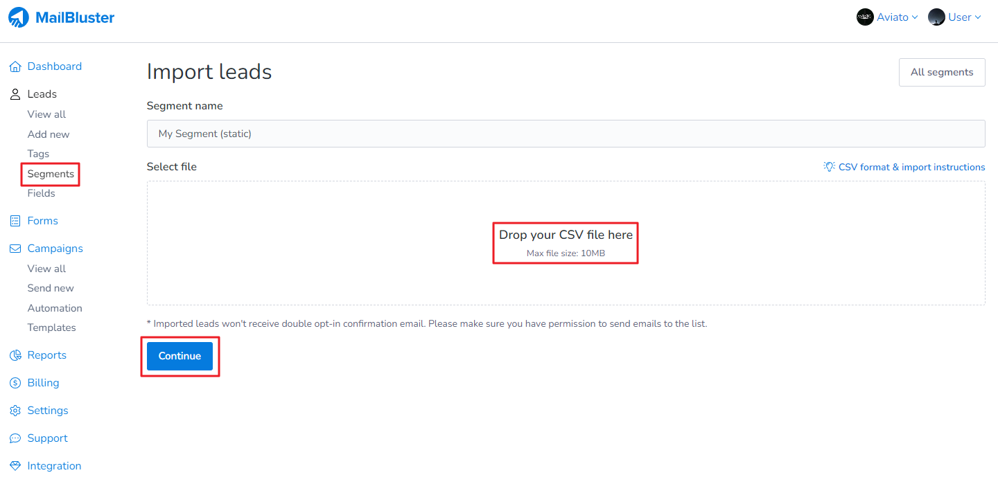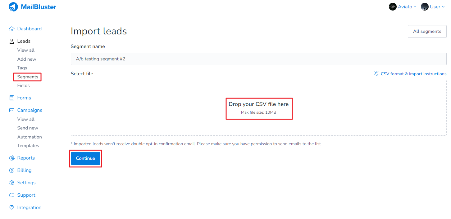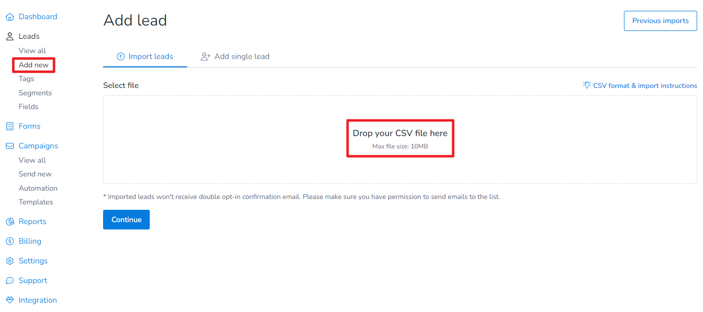 However, you can work around this limitation by splitting the CSV file using any third-party application and then importing the smaller files to MailBluster Leads.
