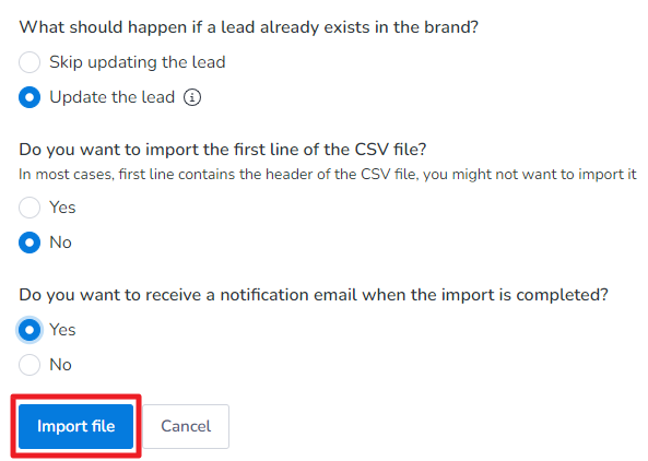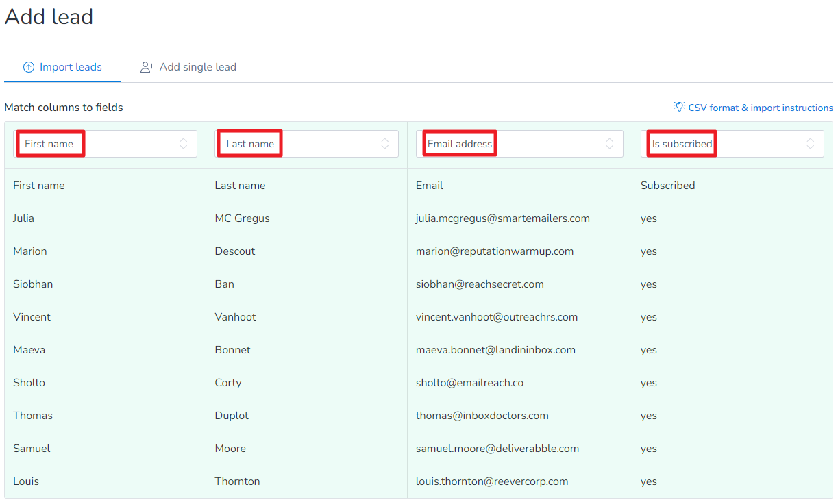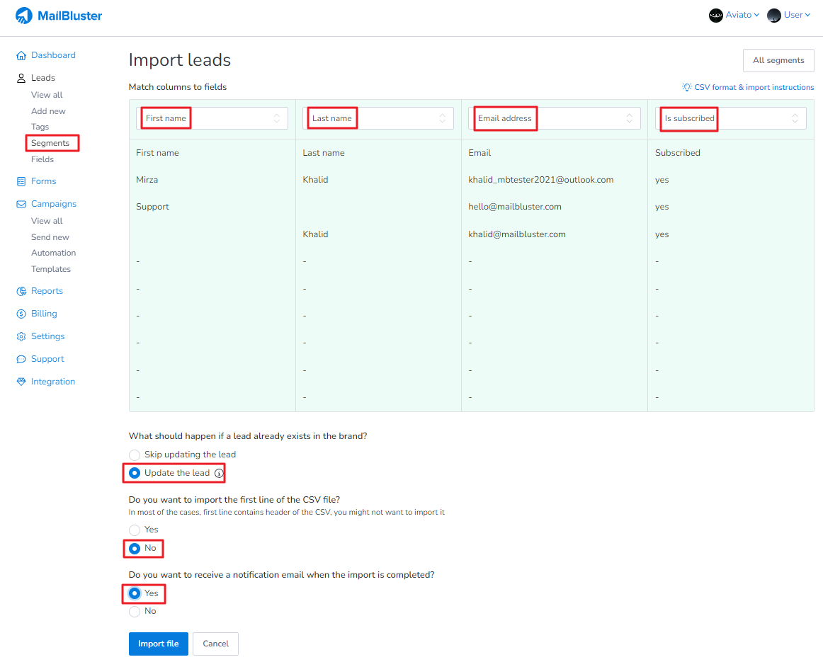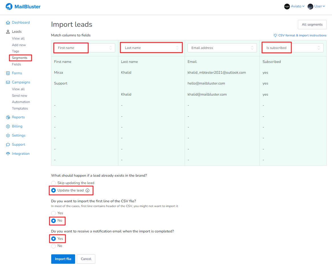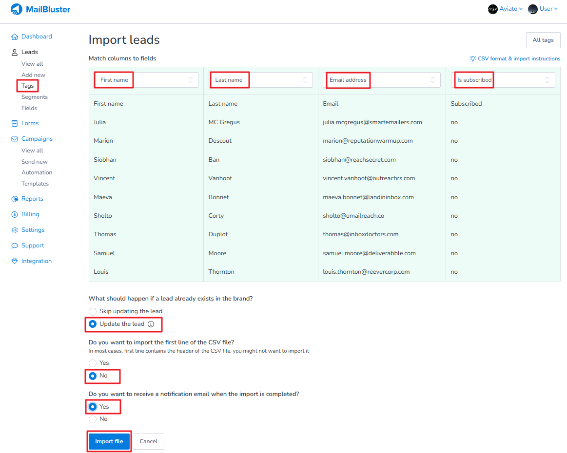 Finally match the first name/last name column of your CSV file to the first name/last name field and Subscribed with Is Subscribed. Email column is automatically matches with Email address field. Be sure to set Update the lead if lead already exists, “Do you want to import the first line of the CSV file” to No. Then click Import file.