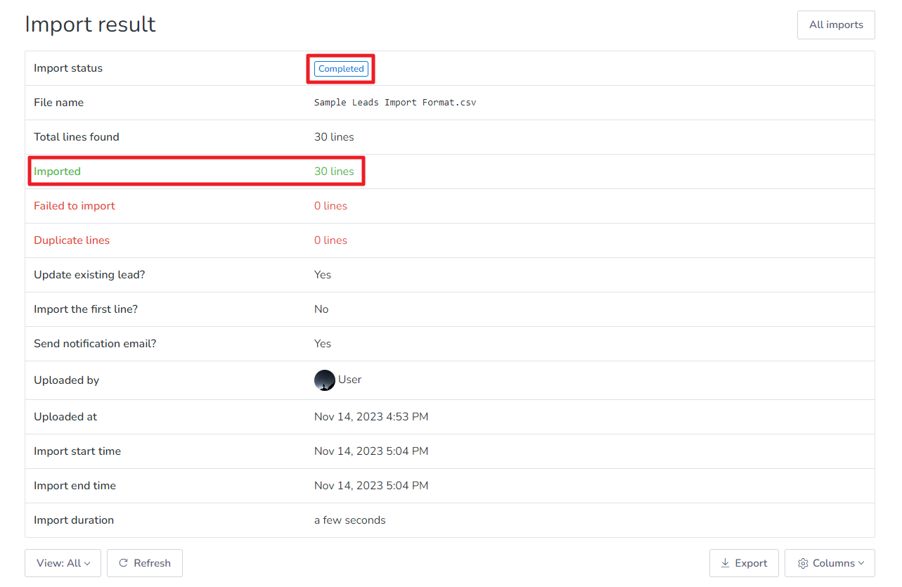 Once the CSV file imports successfully, it will show “completed” as shown here.