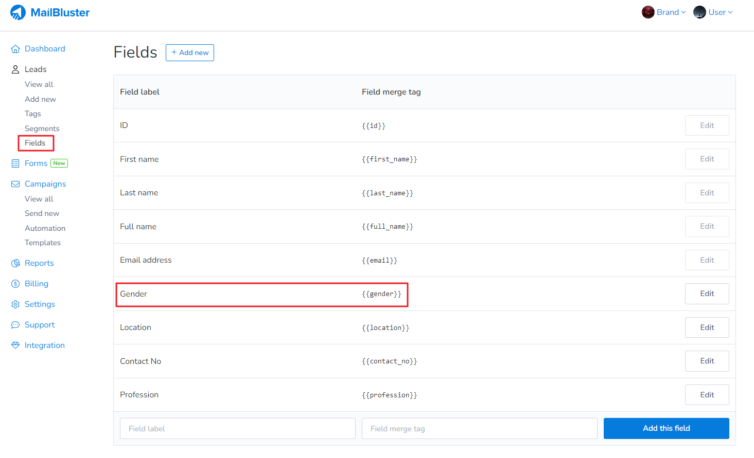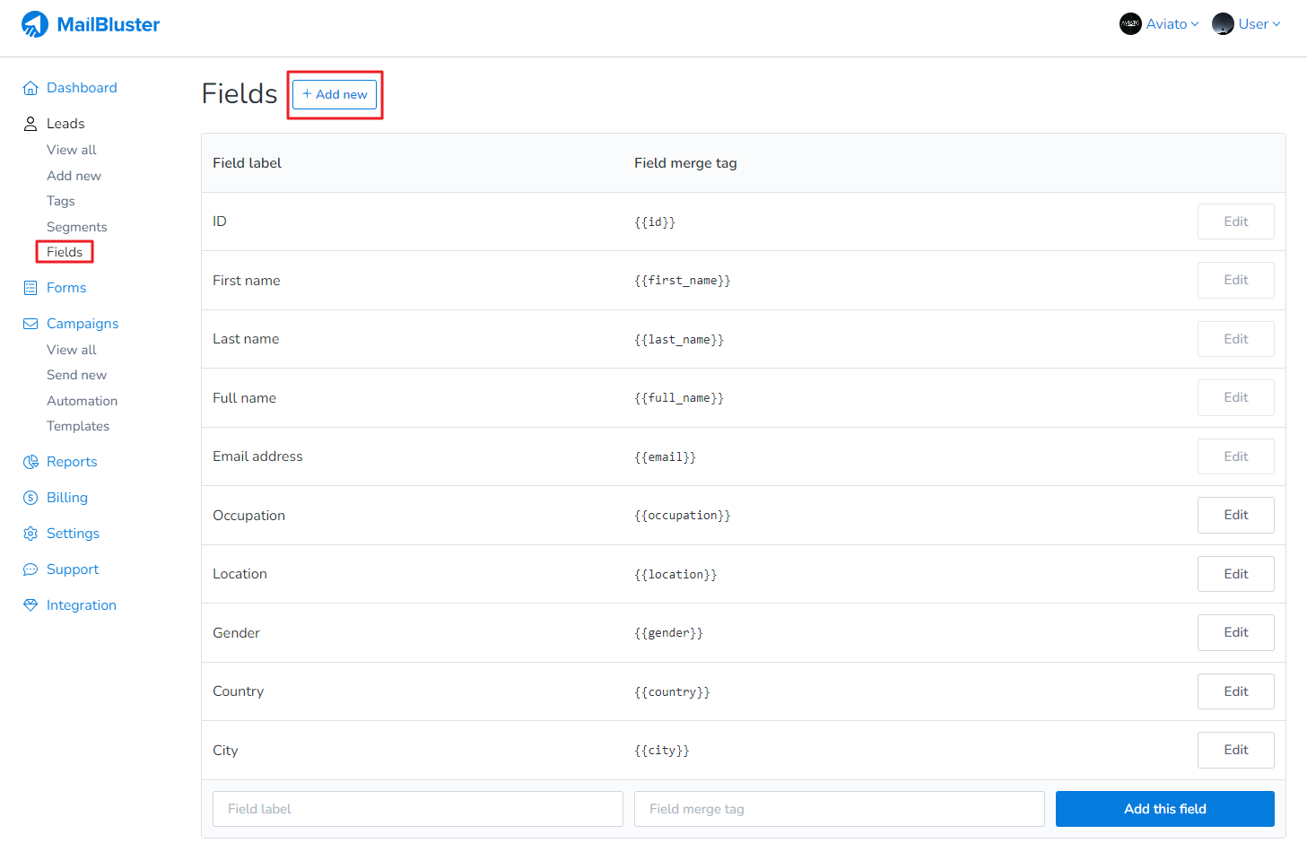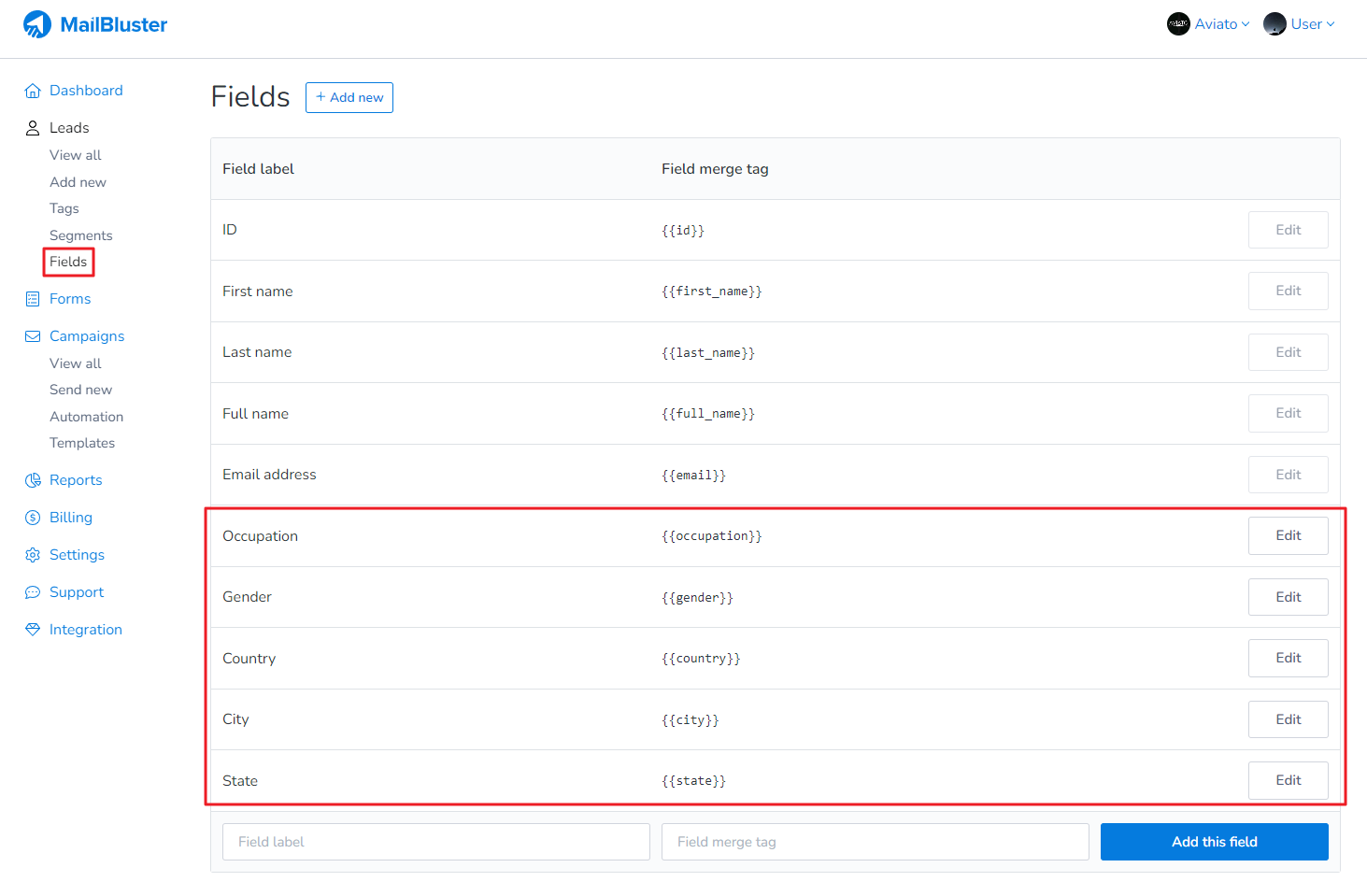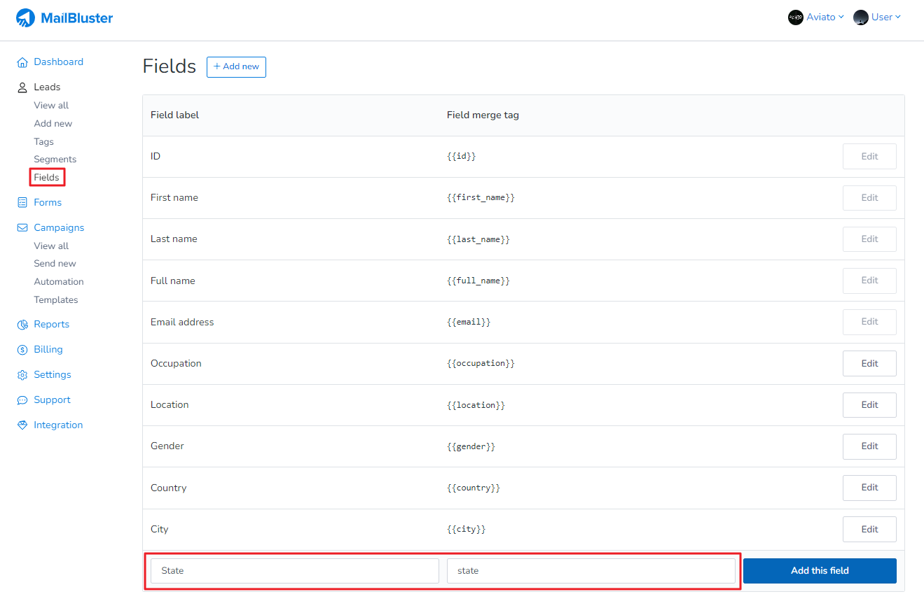 A field is a feature in MailBluster (under MailBluster > Fields) which allows users to place fixed values or merge tags: ID, First name, Last name, Full name and Email address inside subject, email content (email body) and inside every lead information.