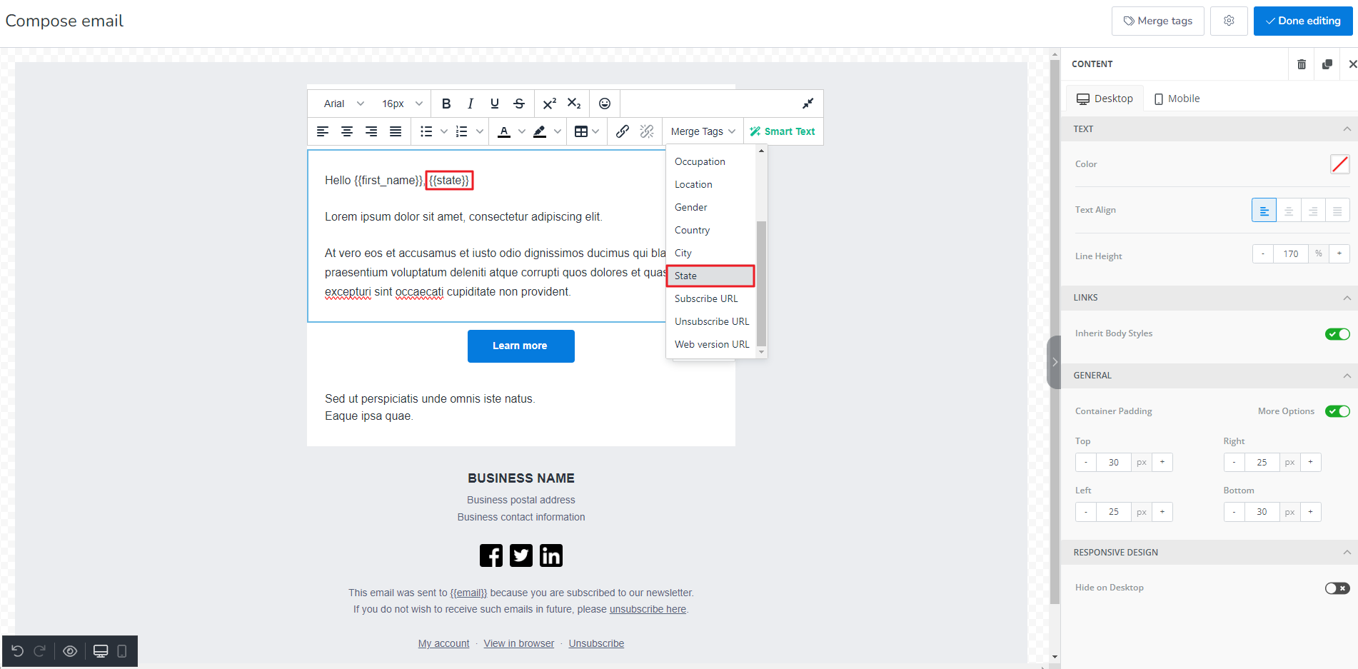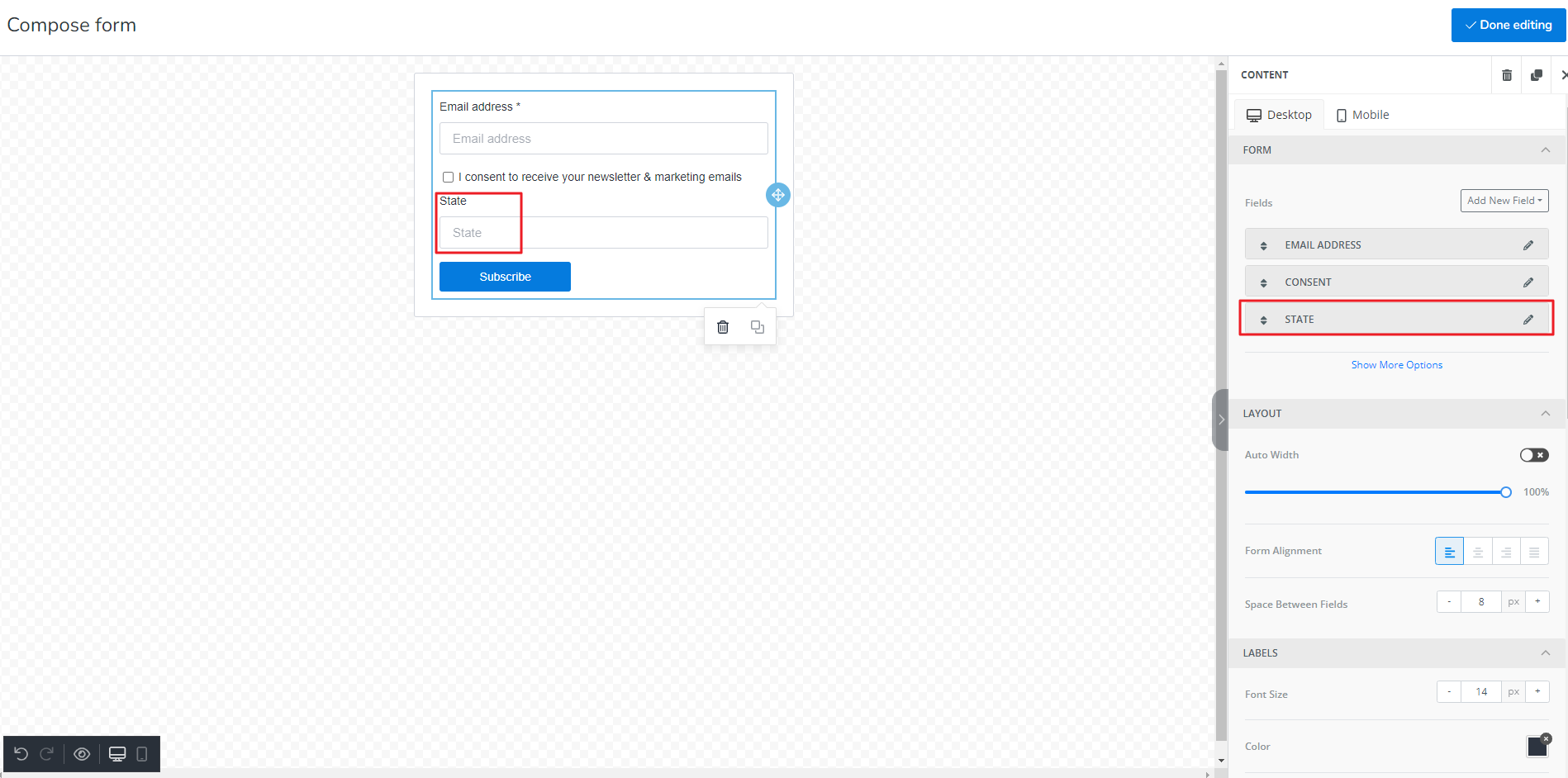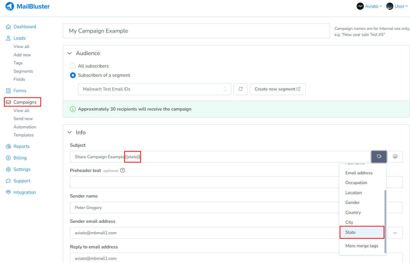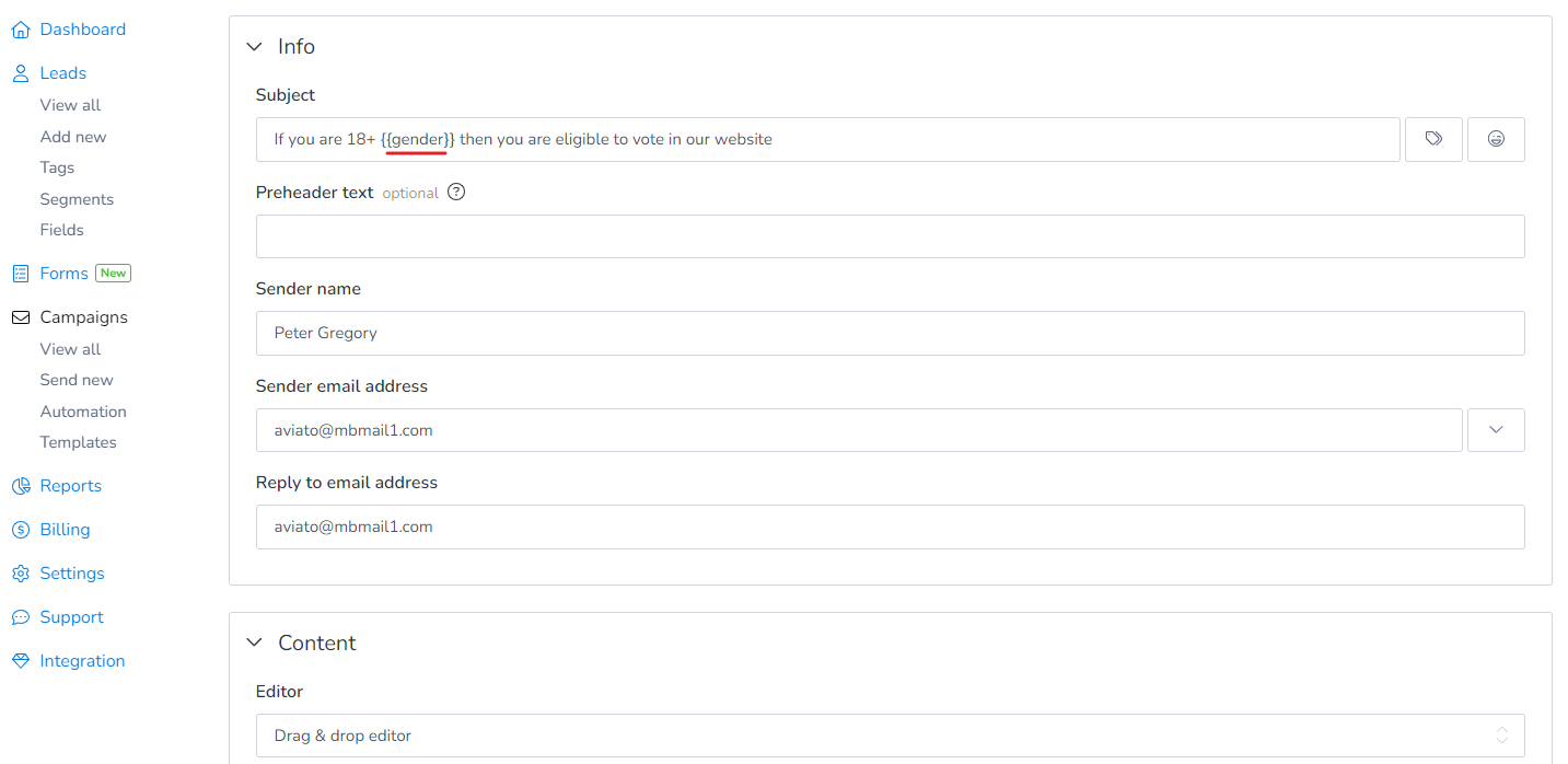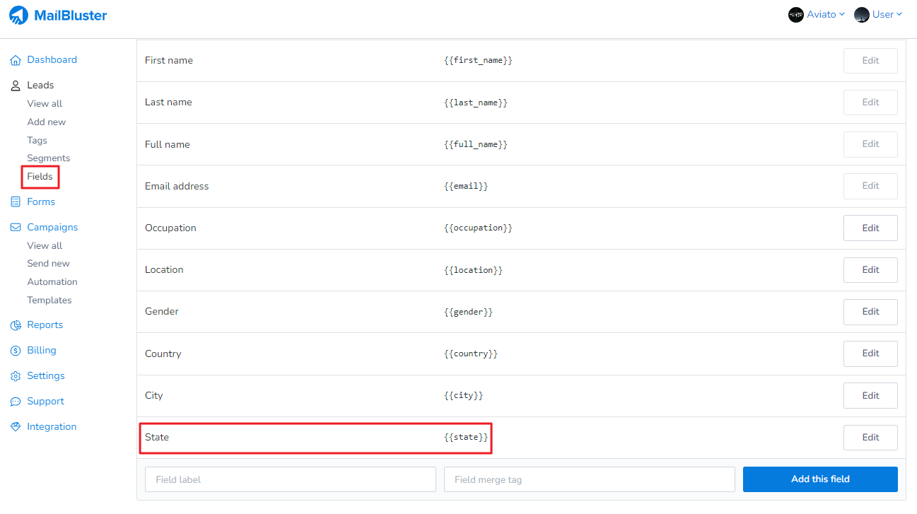 A field is a feature in MailBluster (under MailBluster > Fields) which allows users to place fixed values or merge tags: ID, First name, Last name, Full name and Email address inside subject, email content (email body) and inside every lead information.