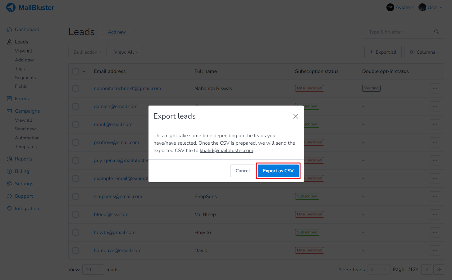 A popup dialog box will appear showing the email address of the User where the download link will be sent. Click on Export as CSV and you will receive an email on the mentioned email address with the download link.