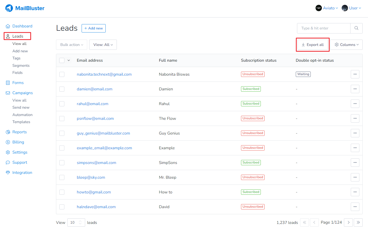 To export Leads from MailBluster, you need to go to Leads section, and click Export all.