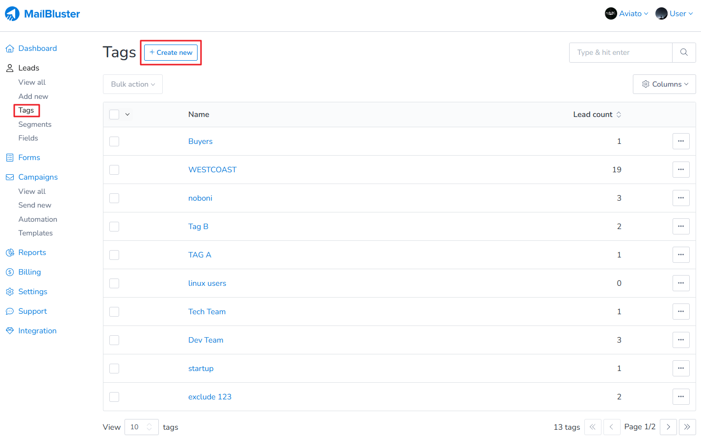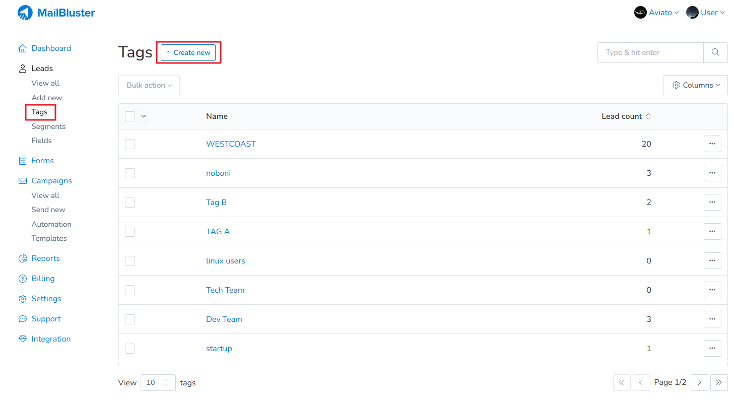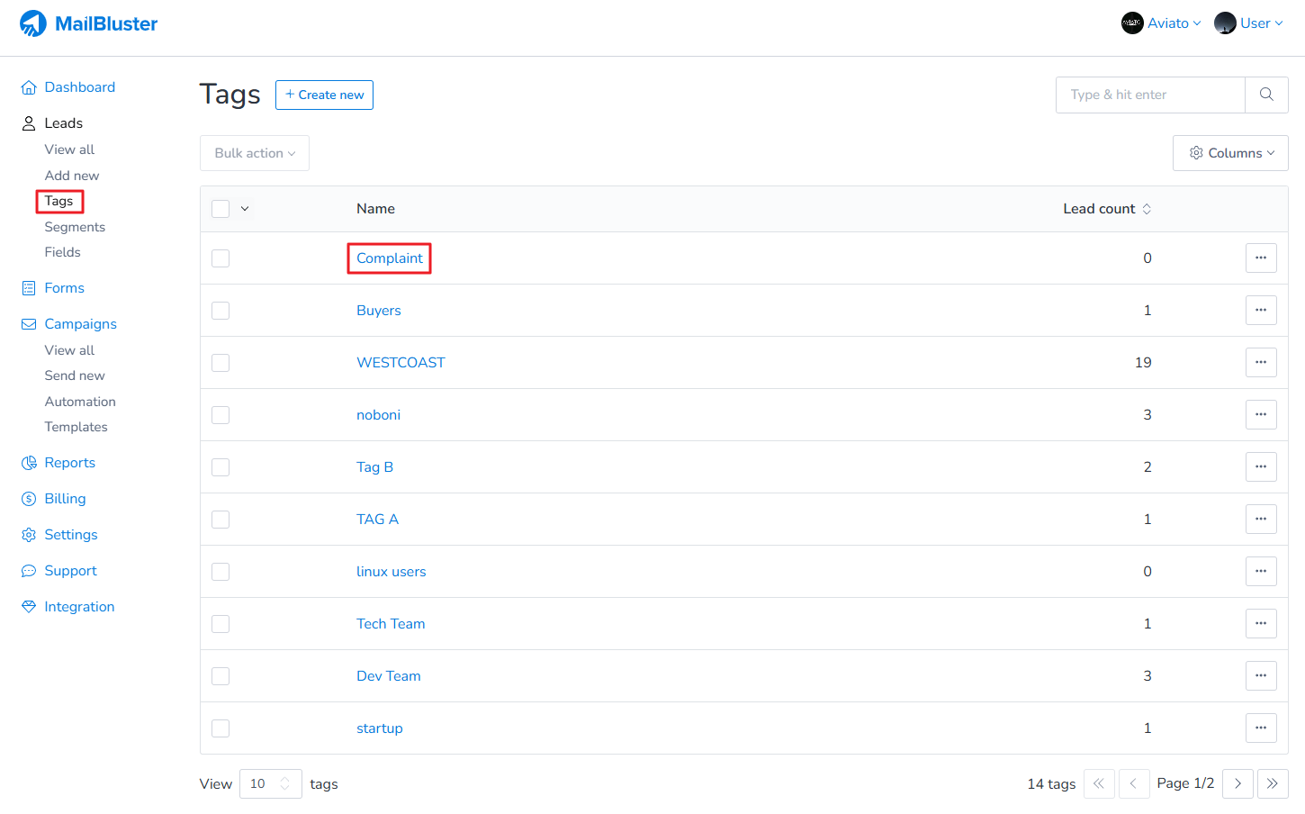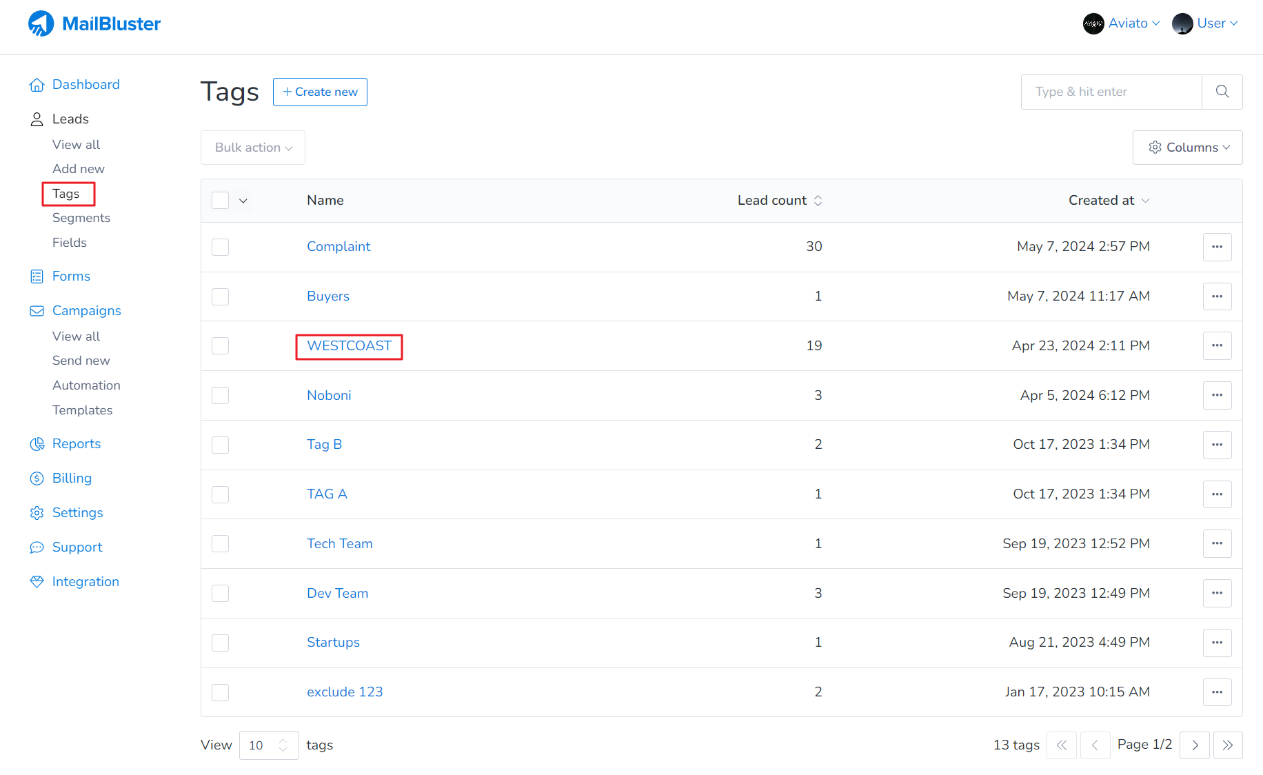 Also, if you click on Tags, you will notice the Lead count of tag “WESTCOAST” is showing 0.