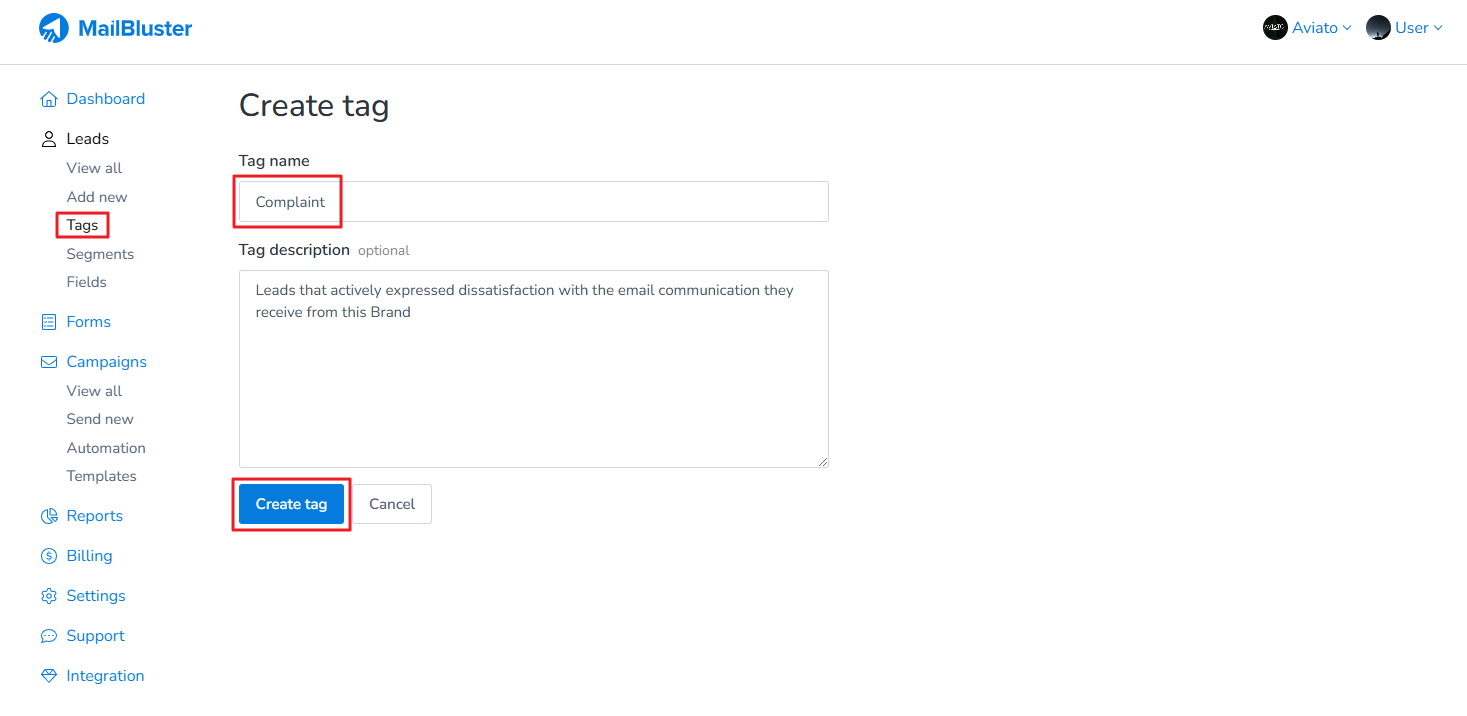 Here we created a tag name “Complaint” for example. Now click on the tag.