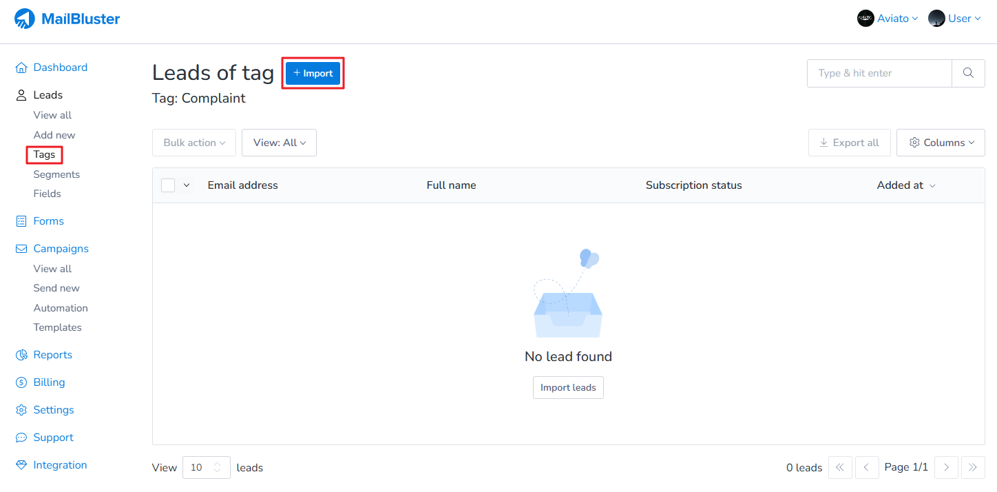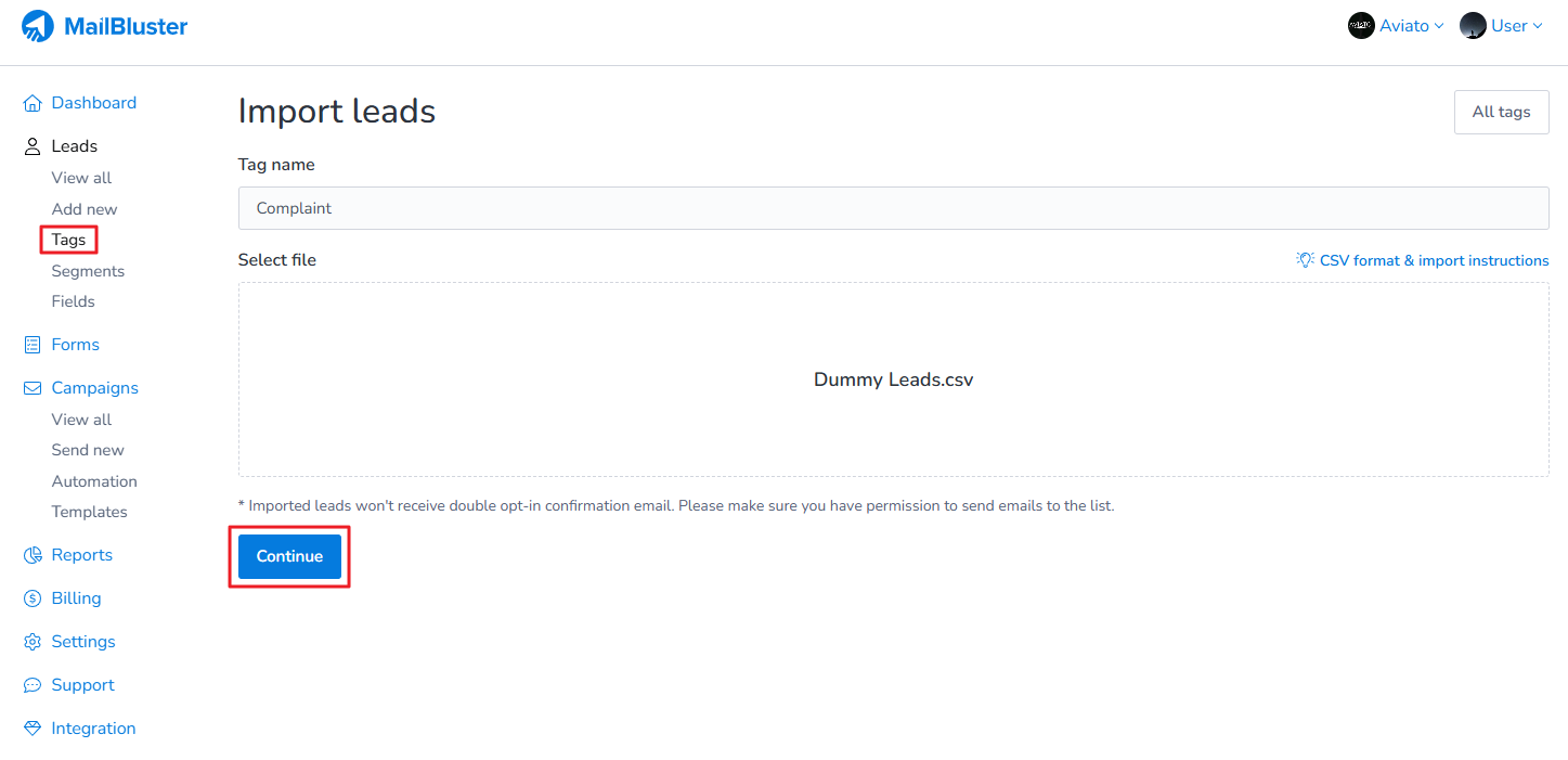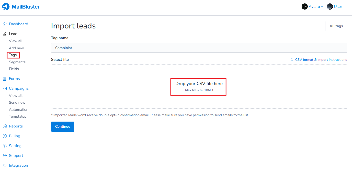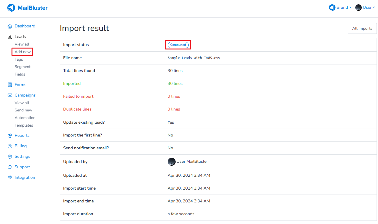 To import leads with Tags, first you need to sign in to MailBluster > Brand > Add new > Import leads. Then Drag and drop a CSV file containing Leads with Tags.