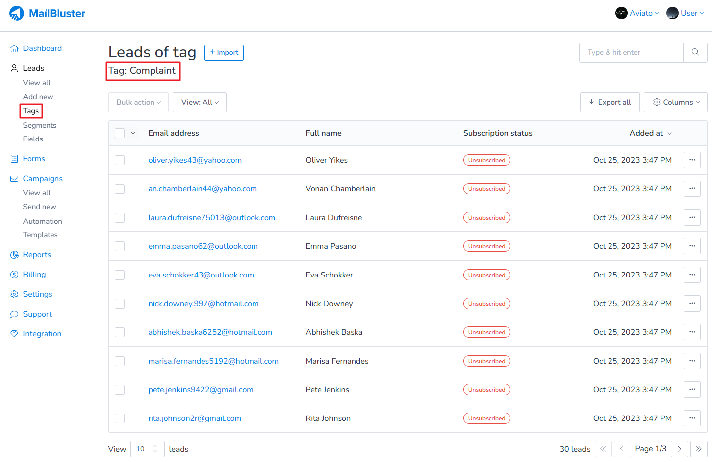 Here is an example of dummy leads imported under Complaint and they are all at unsubscribed state.