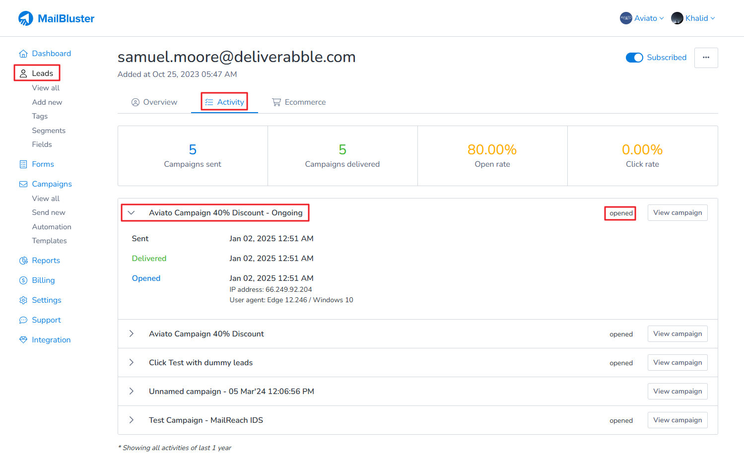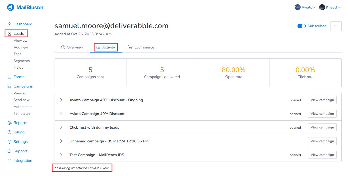 First, go to Leads and search for or select the specific lead. Then, click on the Lead > Activity tab. This will open a tab displaying all the campaign activities for that lead over the last year, as shown below.