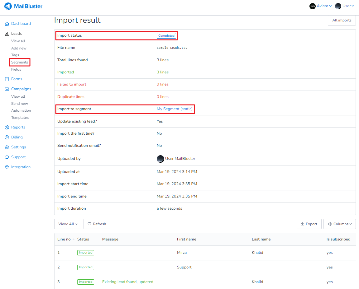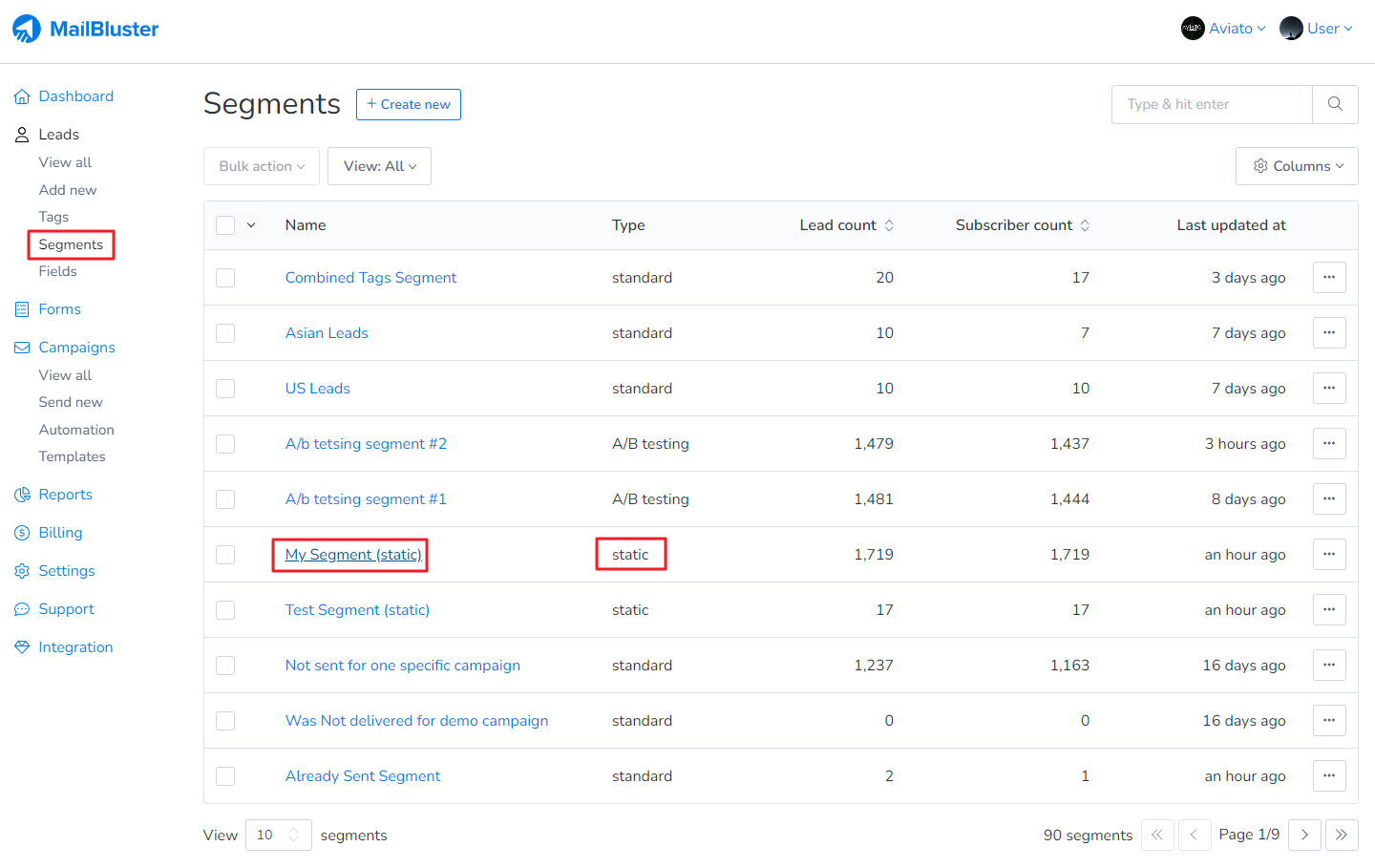 Notice the type of segment “static” and click on the segment which you want to import leads to.