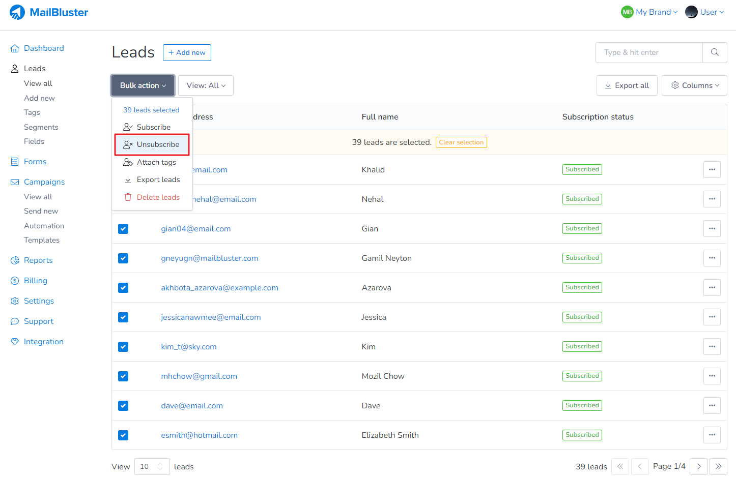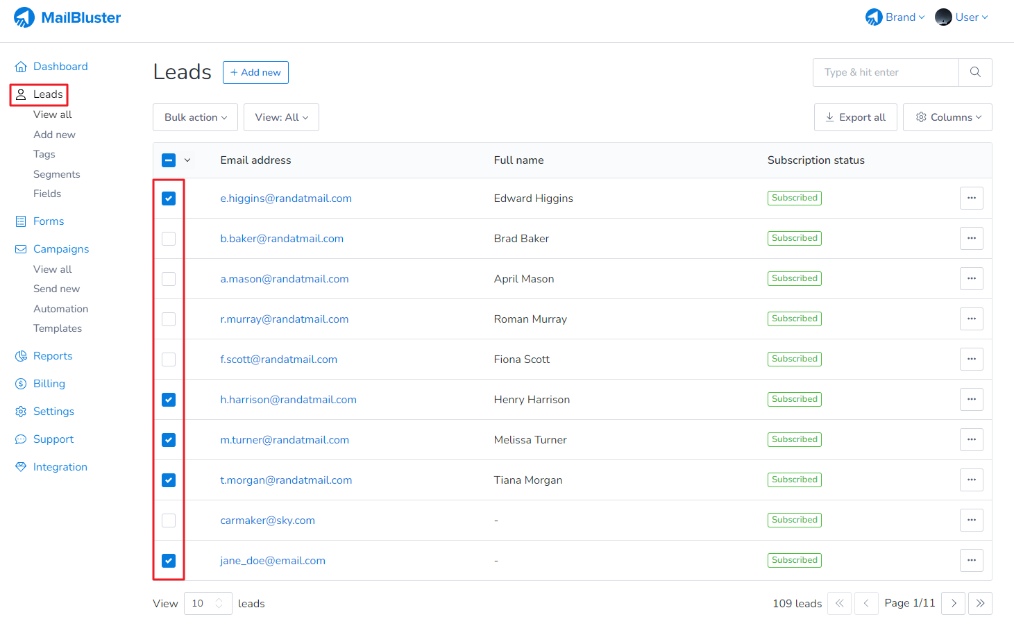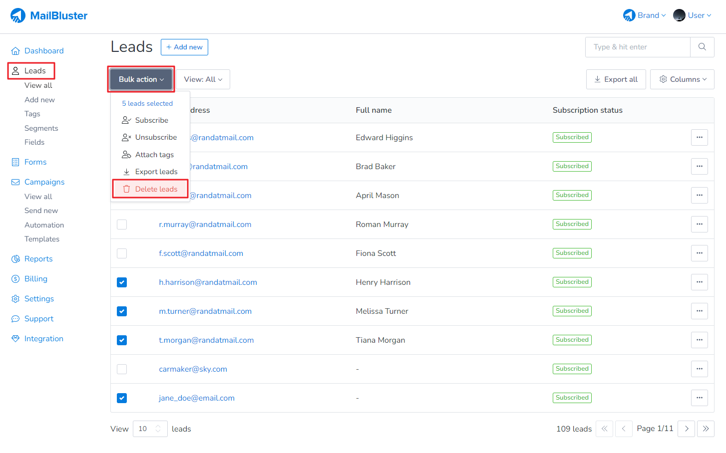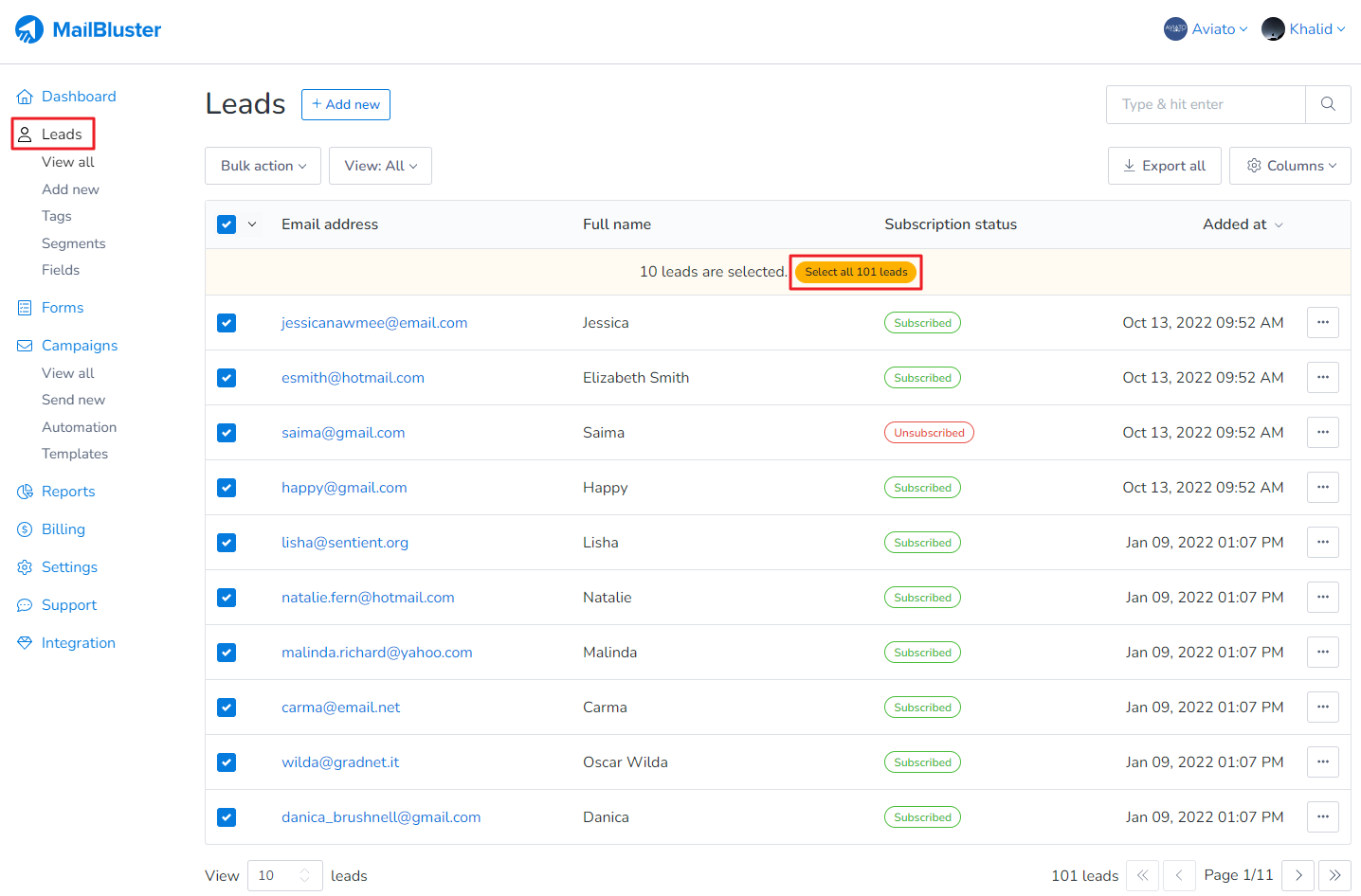 After clicking the checkbox, leads on Page 1 will be selected. If you want to select all the leads stored in MailBluster, the click on Select all X leads where X is the total number of leads.