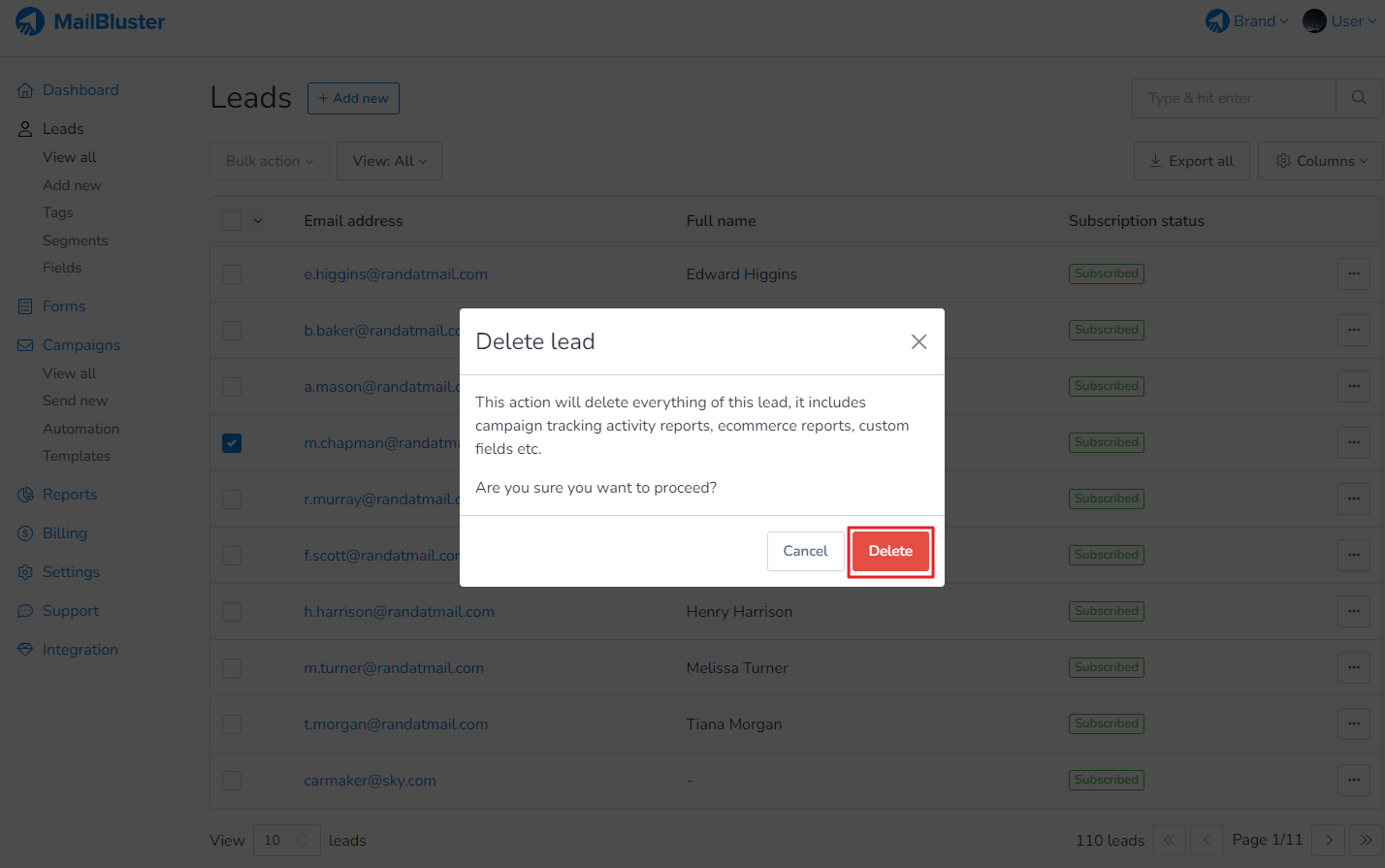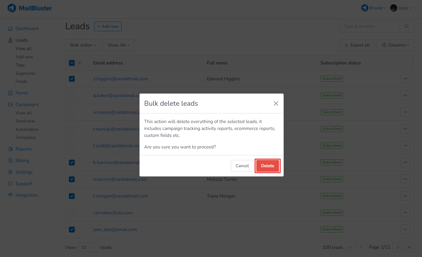 A popup dialog box will appear for confirmation, click Delete and all the leads from that brand will be deleted permanently.