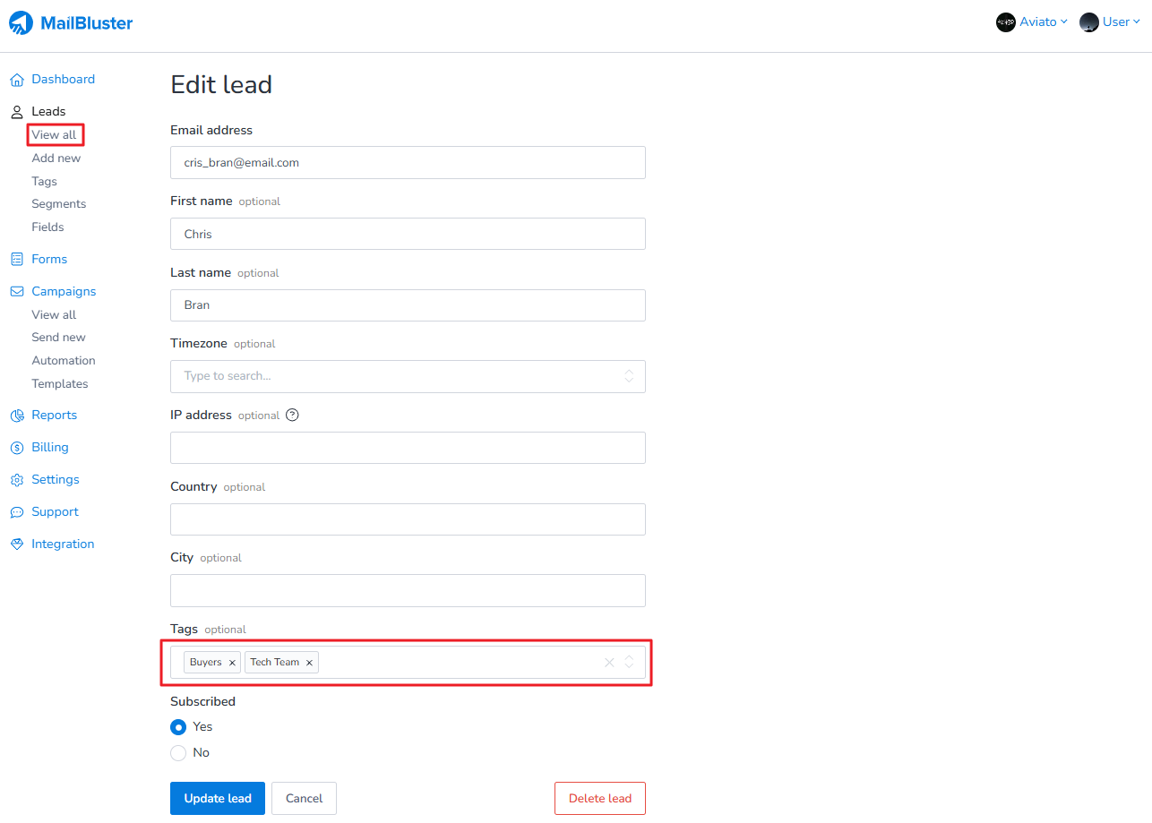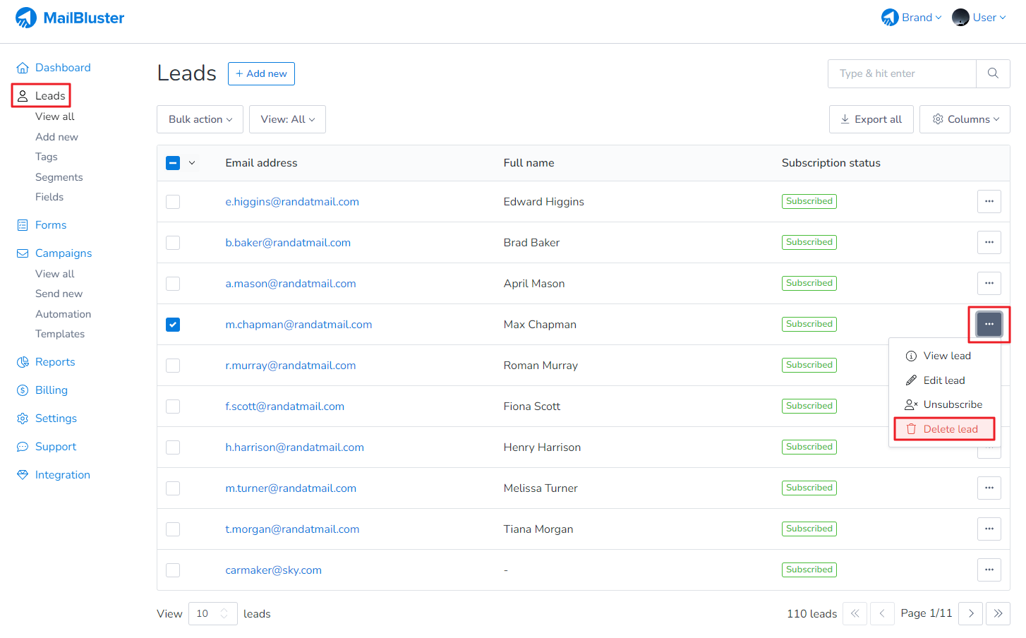 To delete a single lead from MailBluster, go to Leads, then select any lead by ticking the checkbox. Then click on the … 3 dots ellipsis then click on Delete lead.