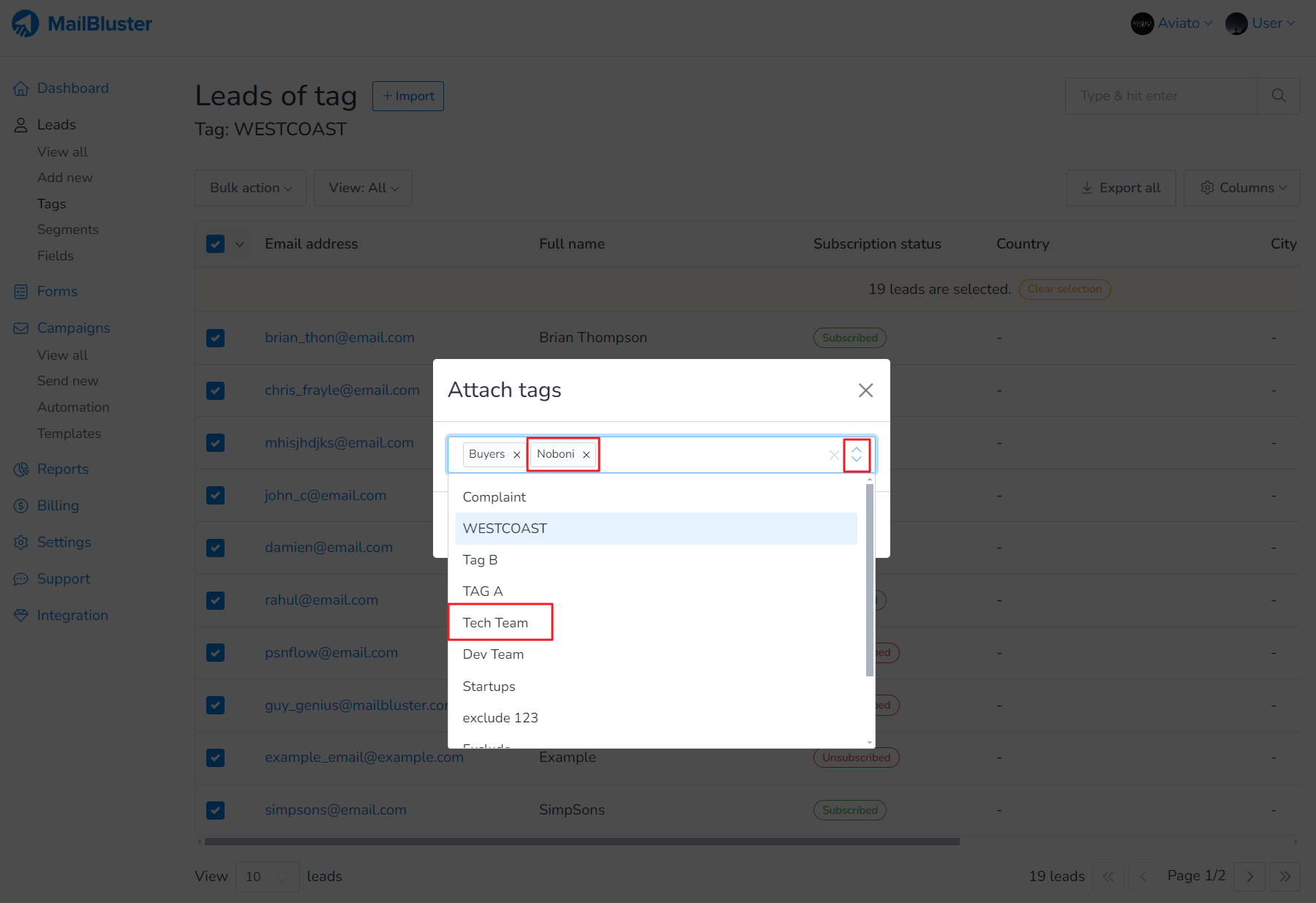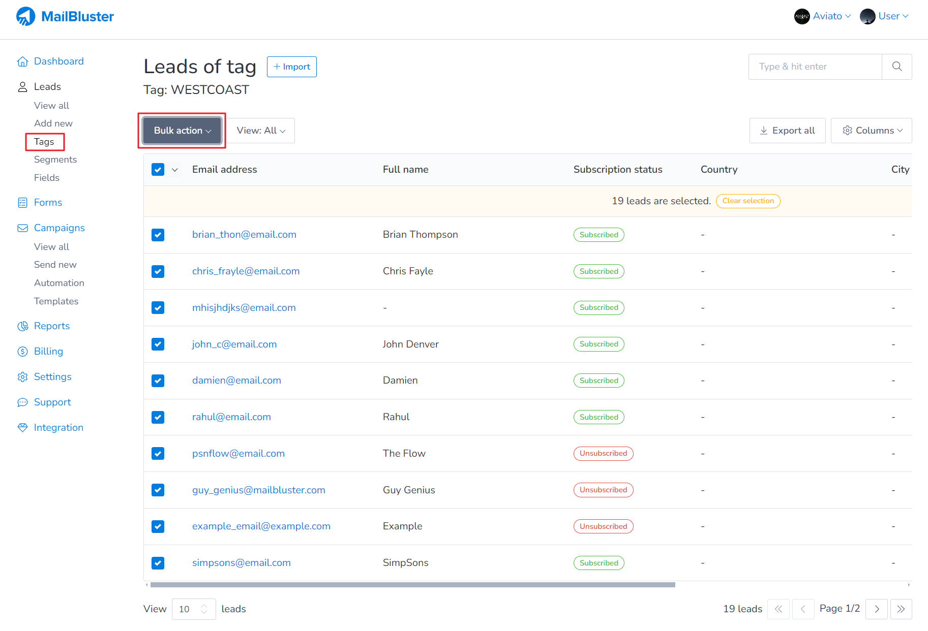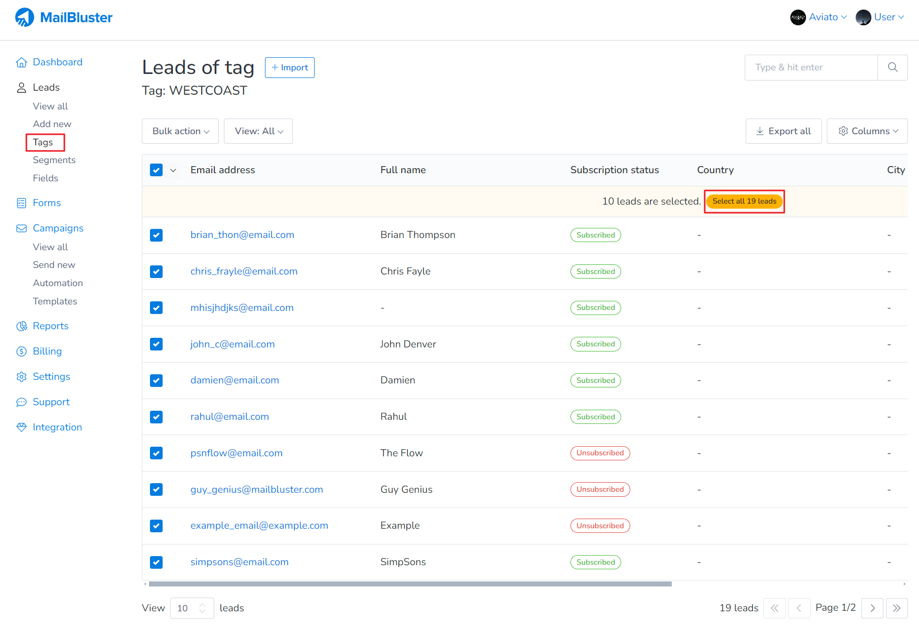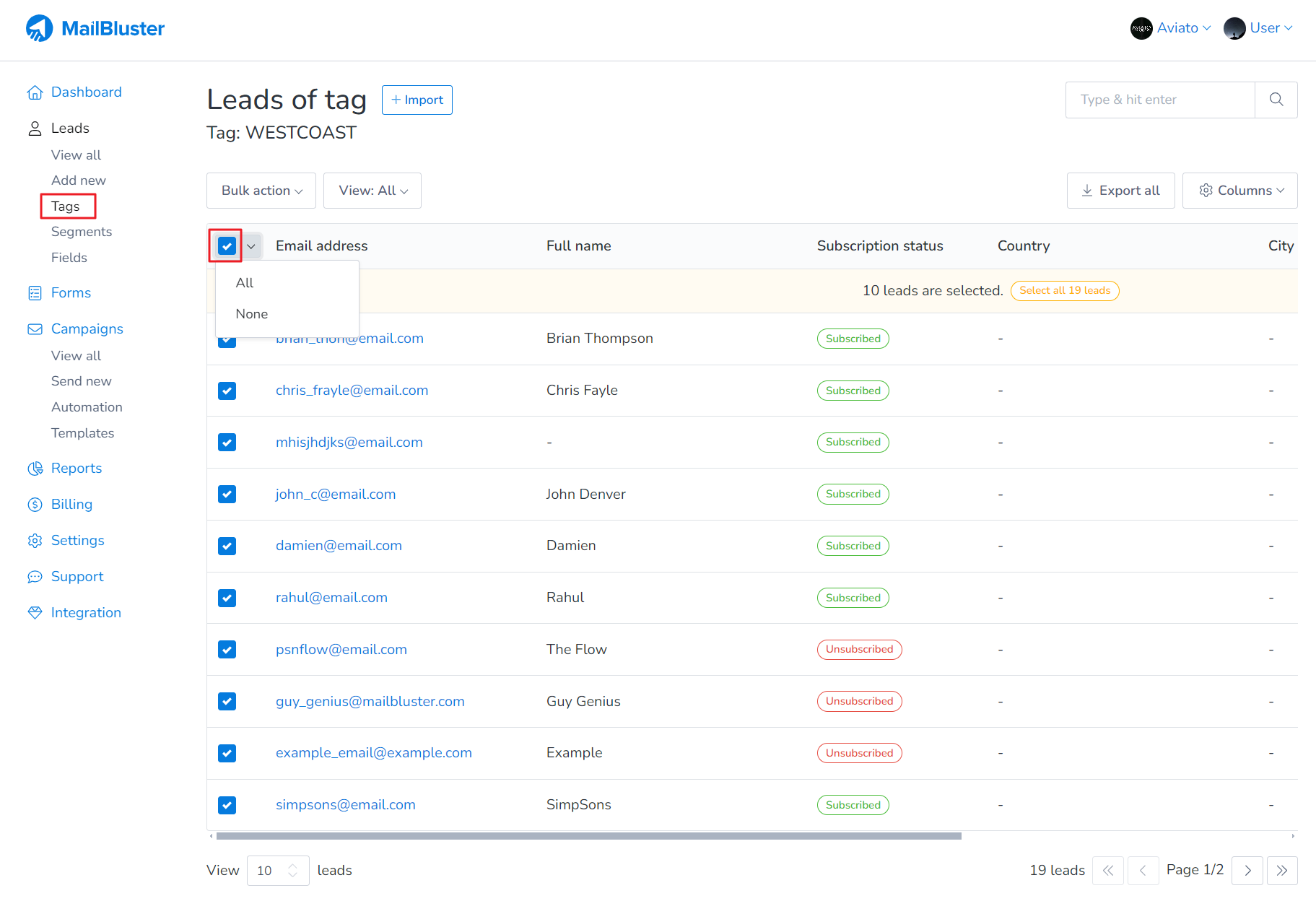 You can also select all the leads assigned to this tag. Here we clicked on Select all 19 leads under this tag.
