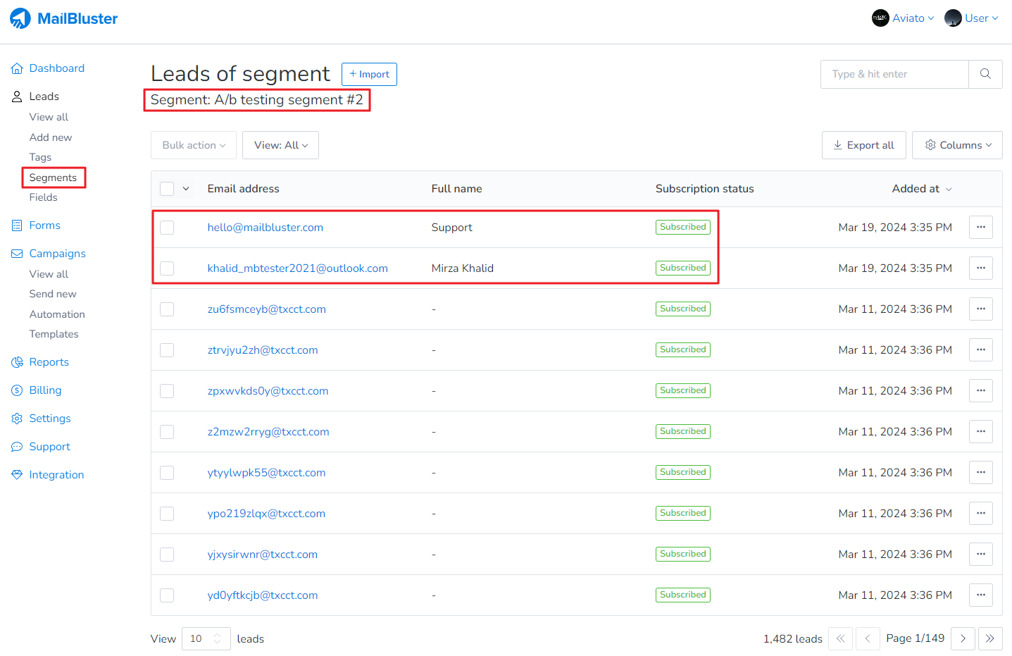 Now go to the A/B testing segment and you will see that your leads are added to that segment.