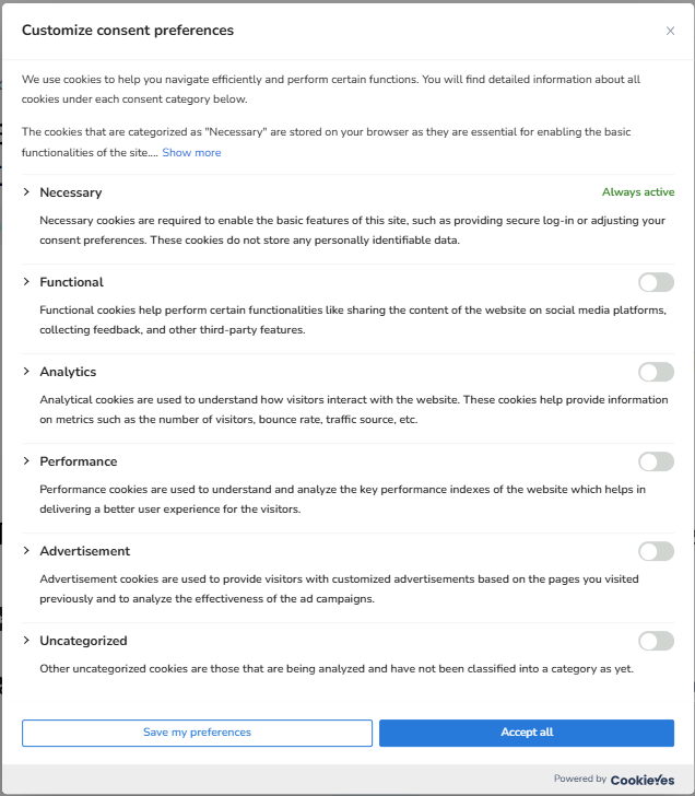 While some necessary cookies are essential for the core functionality of the platform and cannot be disabled, all non-essential cookies can be turned off through the customization settings which are shown below. This approach aligns with standard practices and complies with regulations, as long as users are given clear control over optional cookies — which MailBluster does provide.