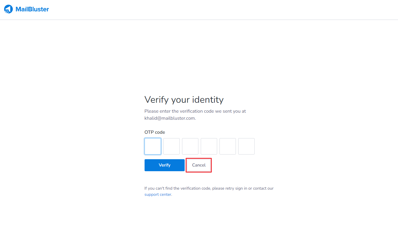 When signing in to MailBluster, if the screen below pops up, instead of typing a random OTP code, just click Cancel. You will then be asked to enter the OTP code again, and a new email with a new OTP code will be sent to your email address.