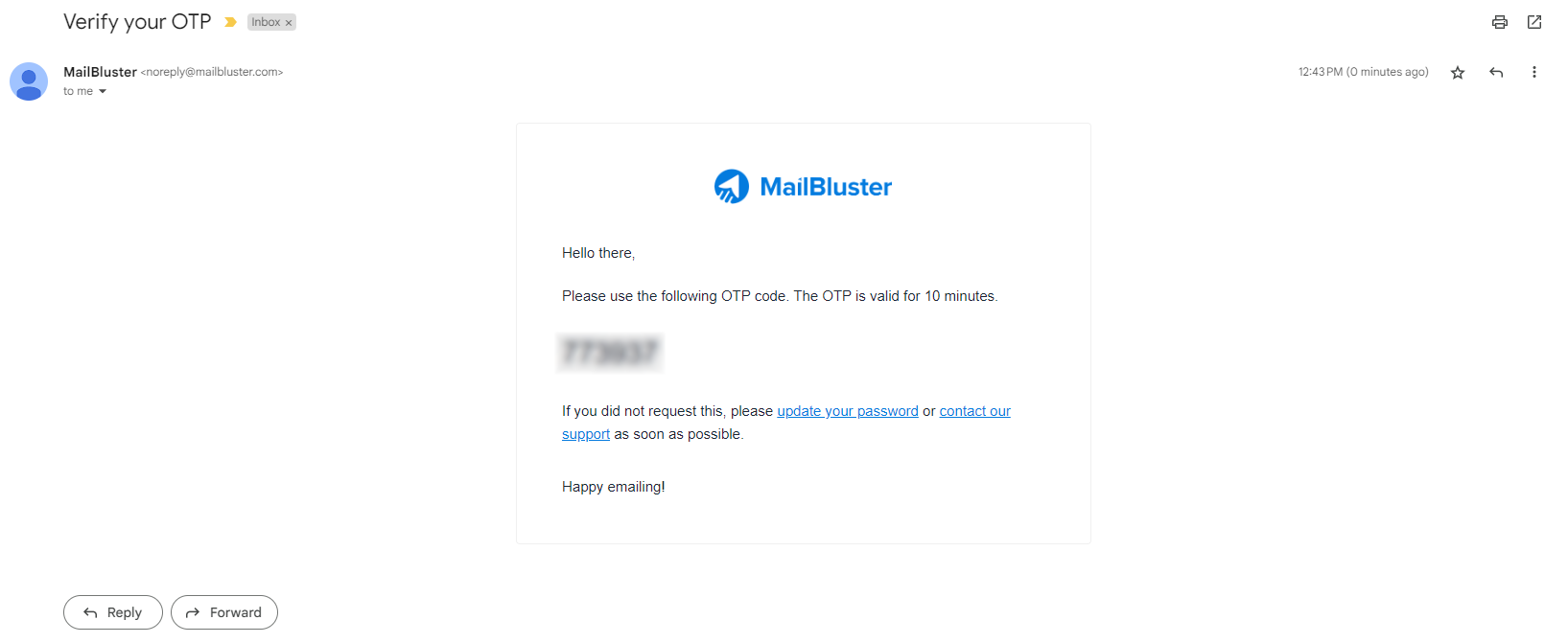 You will receive a new OTP code as shown below. Enter the new OTP code exactly and you will be able to sign in to MailBluster. Please note: Every OTP code expires after 10 minutes of receiving it in inbox of your registered email.