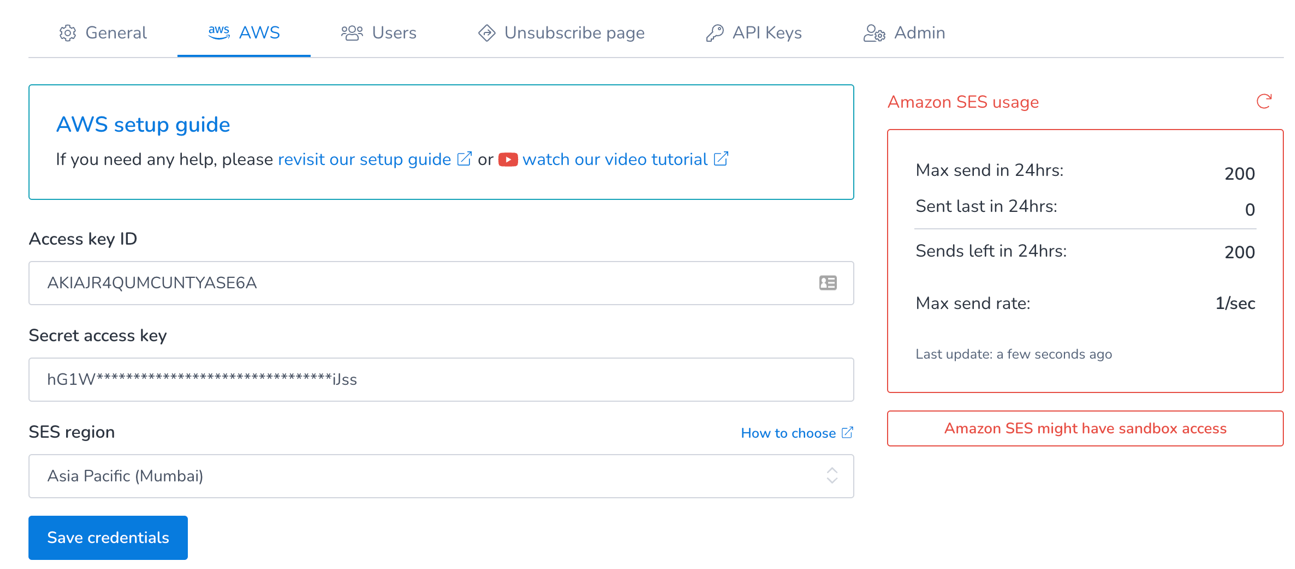 But if it wasn’t updated, then most of the time, the reason is that Amazon SES moved you out of the sandbox in a different region (not the one that you have selected). The confirmation email should contain the Region; please choose the same region on MailBluster.