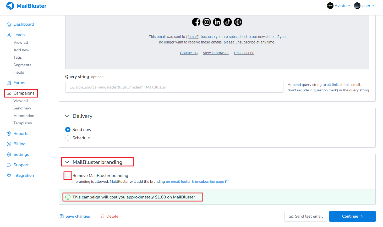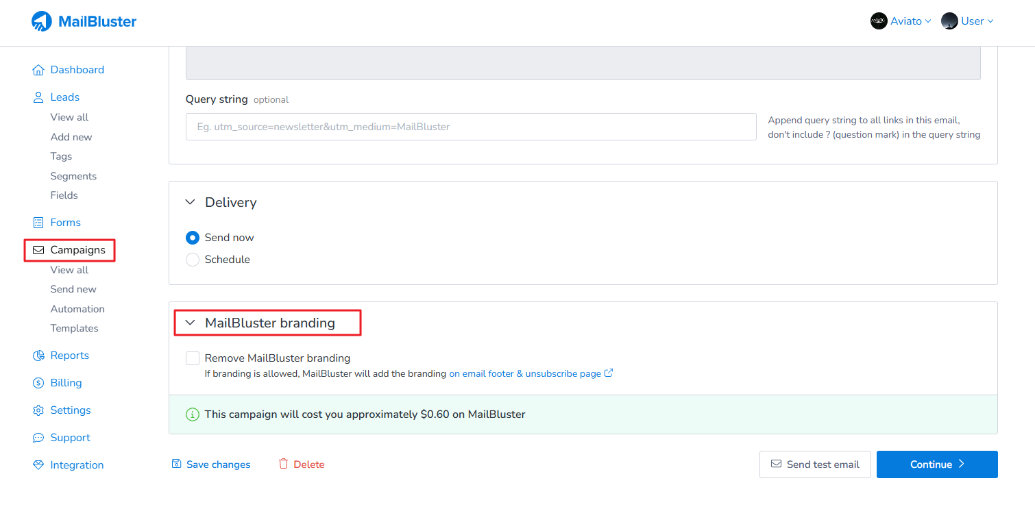 Here, we have left unchecked ‘Remove MailBluster branding’, but still the campaign is showing total cost to send bulk emails.