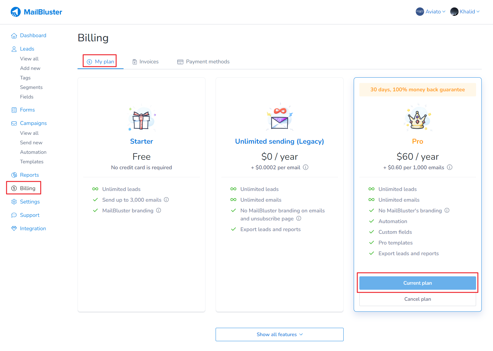 If you haven’t used the 3k free email quota included in the “Starter” plan, you can still access it by switching back to the “Starter” plan from the “Pro” plan. For example, if you initially switched to the “Pro” plan without using the free emails, you can revert to the “Starter” plan to utilize the 3k free email campaigns. However, if you have already used up the free 3k emails while on the “Starter” plan, you will need to upgrade to the “Pro” plan to continue using MailBluster.