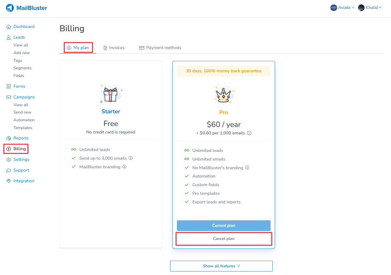 To cancel your current MailBluster plan, first go to your Brand > Billing > My plan, and then click on ‘Cancel plan‘ under your Current plan. Below is a screenshot showing how to cancel any current plan correctly.