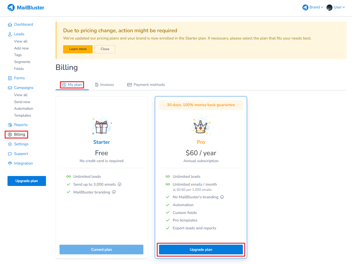Currently, there are two plans available in MailBluster: Starter and Pro. The Starter plan allows you to send 3,000 free emails (one time only)across all your brands you have created earlier. If you exceed this limit, you will be requested to upgrade to Pro plan. Once you switch to Pro plan, a subscription fee of $60 per year which is equivalent to $5 per month is deducted from your billing card for each brand. Additional $0.60 will be charged at the end of each month for every 1000 emails you sent from each of your Brand. Under Pro plan, you will be able to use any upcoming special features as well as Automation, custom fields, Pro templates, lead and report exporting, removal of MailBluster branding, and more.