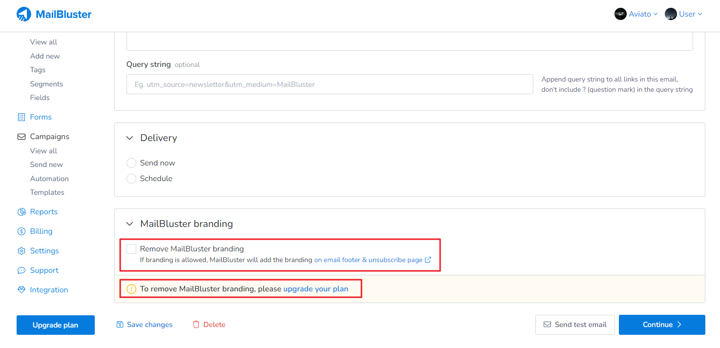 After upgrading to the Pro plan, you can add MailBluster branding to your campaigns simply by leaving the ‘Remove MailBluster branding’ option unchecked.